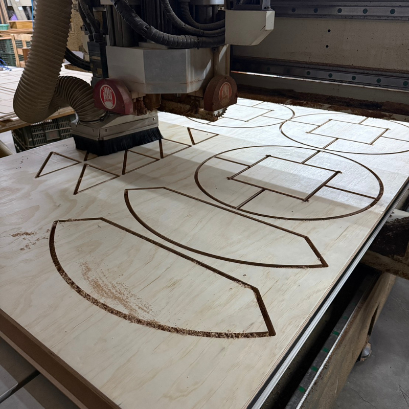 本次案例採用高精度 CNC 雕刻機,以夾板為素材,進行多組圓形與方形嵌件切割。從設計到完成,全程自動化運算,誤差小於 0.1mm,展現了工業級穩定度與工藝感。這樣的服務特別適合設計師、品牌、創作者或家具製造商,將構想快速轉化為可量產樣品或展示成品。