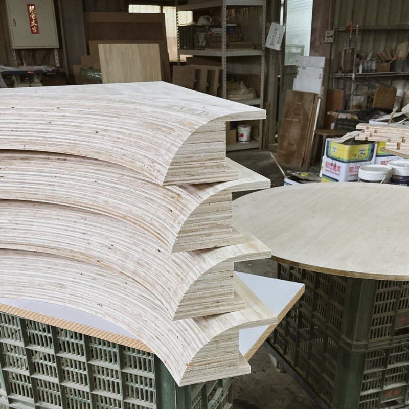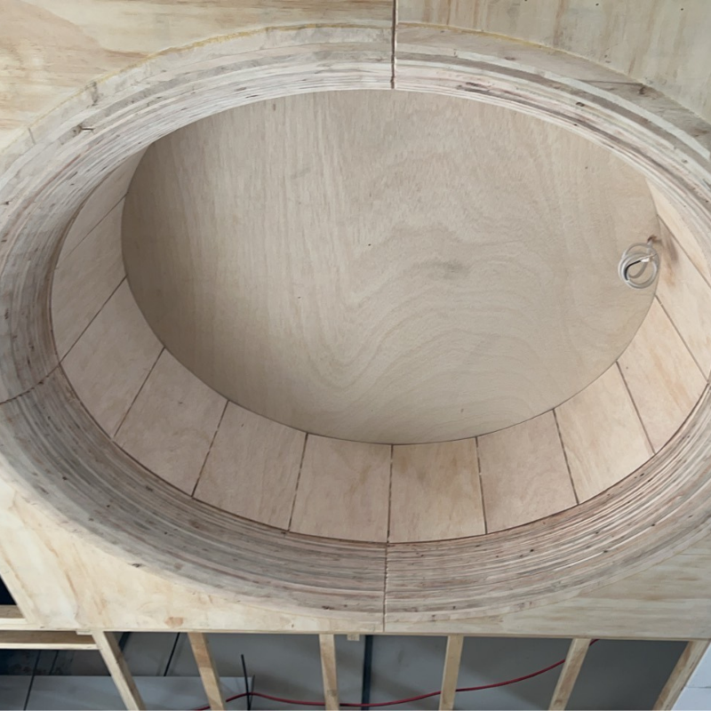 這次作品以堆疊切層的方式,使用夾板搭配CNC精密加工,製作出一個圓形天花板造型。從一片片木板到完整的立體結構,每一道切線、每一層厚度都經過計算與對位,讓整體彎曲輪廓自然延展,視覺上產生柔和又有張力的空間語彙。